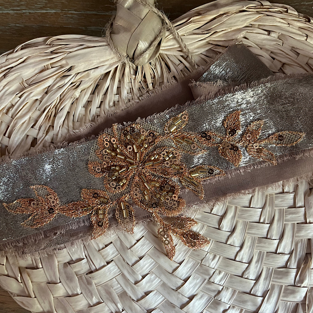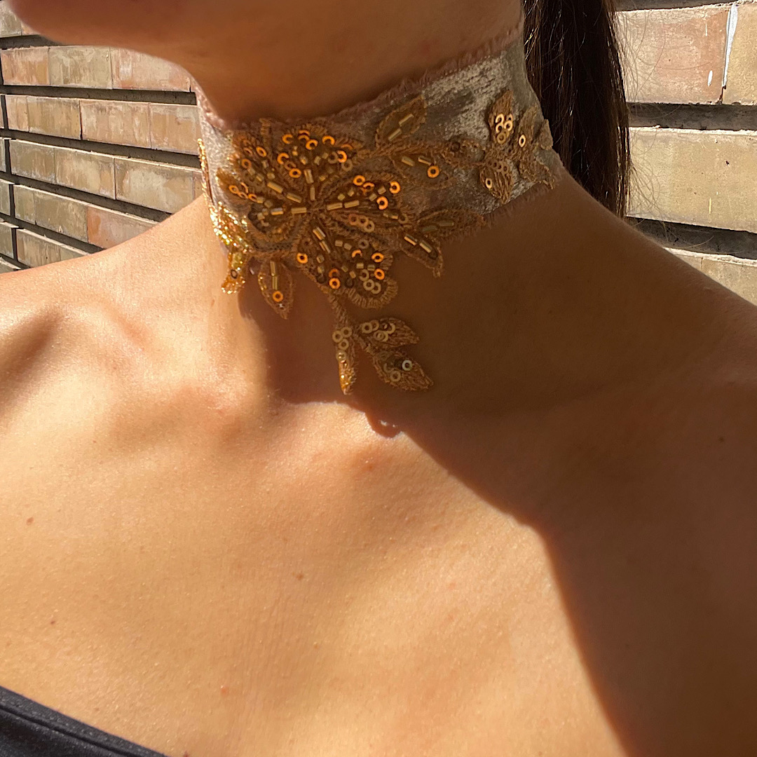 Choker elaborado en tela satinada color bronce, de acabado suave y sutilmente luminoso. Presenta un detalle frontal de pedrería bordada en tonos dorados, compuesto por lentejuelas y aplicaciones que forman un diseño floral delicado. El cierre posterior incorpora bolita de tope ajustable color piedra, acompañada de un lazo que permite adaptar la medida de manera cómoda y segura.