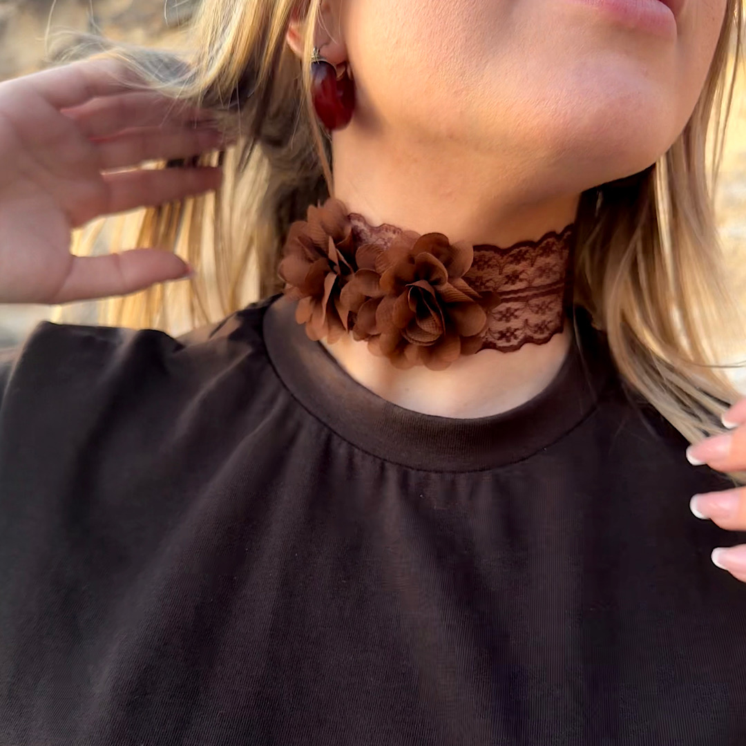 Choker de encaje marrón con delicado diseño romántico, adornado con dos flores de gasa a tono que aportan textura y elegancia. Incorpora cierre ajustable con bolita de tope en color piedra para un ajuste cómodo y sutilmente sofisticado.