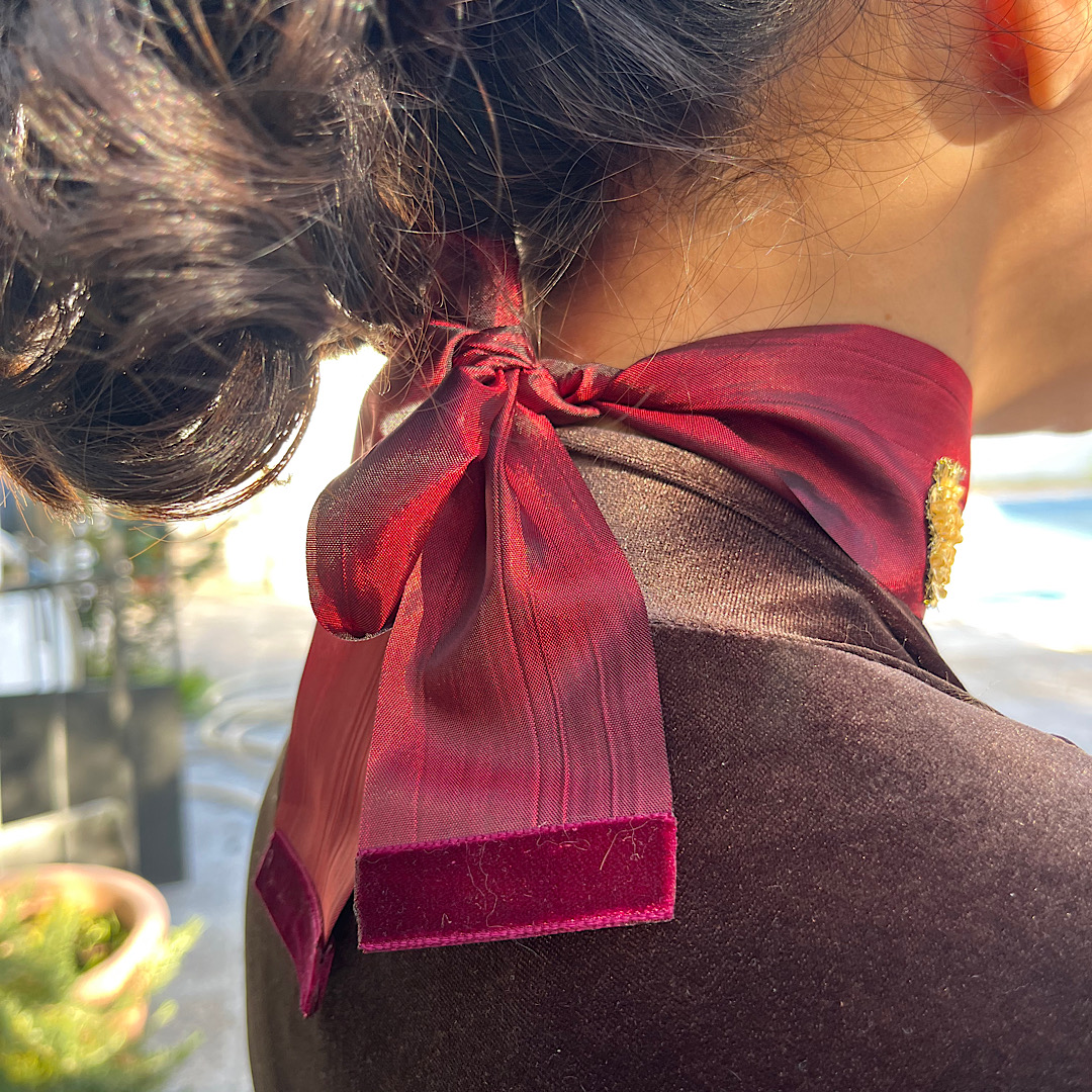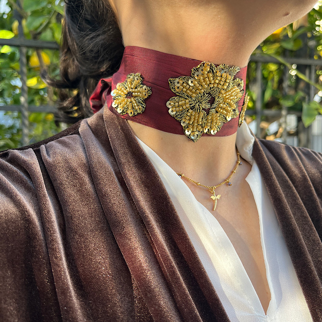 Este choker presenta un diseño elegante y artesanal, elaborado con una banda ancha de tela satinada arrugada en tono burdeos que se ajusta delicadamente alrededor del cuello. Está adornado con aplicaciones florales bordadas en tonos dorados, compuestas por cuentas, lentejuelas y pequeños elementos metálicos que aportan textura, brillo y un acabado sofisticado.