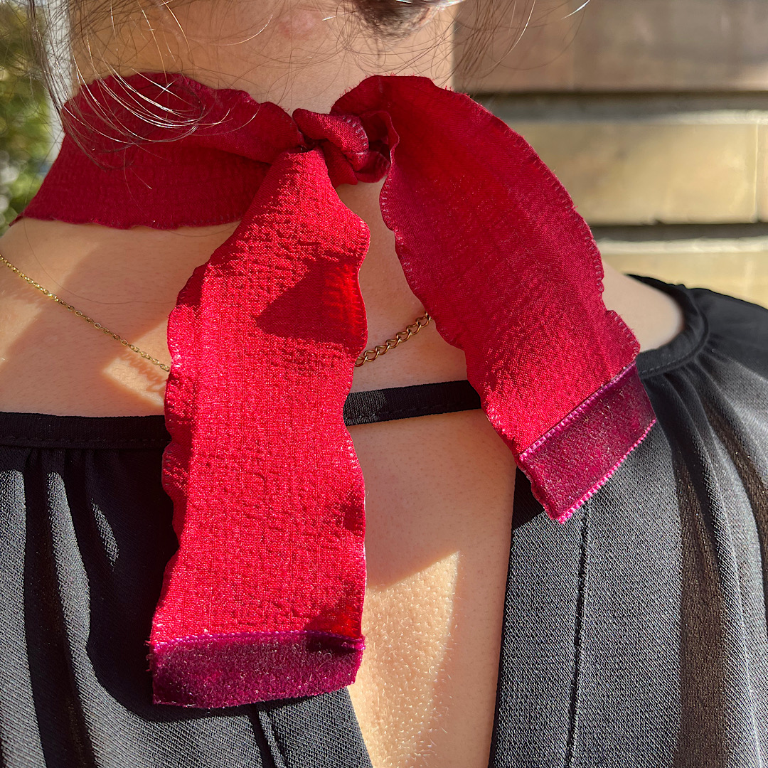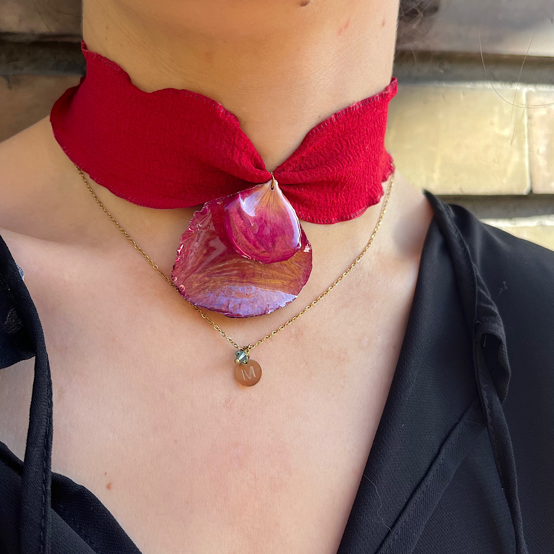 Collar artesanal con un pétalo de rosa natural cuidadosamente encapsulado para preservar su color y textura.  Va suspendida de una cinta textil suave y arrugada, creando un acabado delicado y elegante. Ideal para quienes buscan un accesorio romántico, original y hecho a mano.